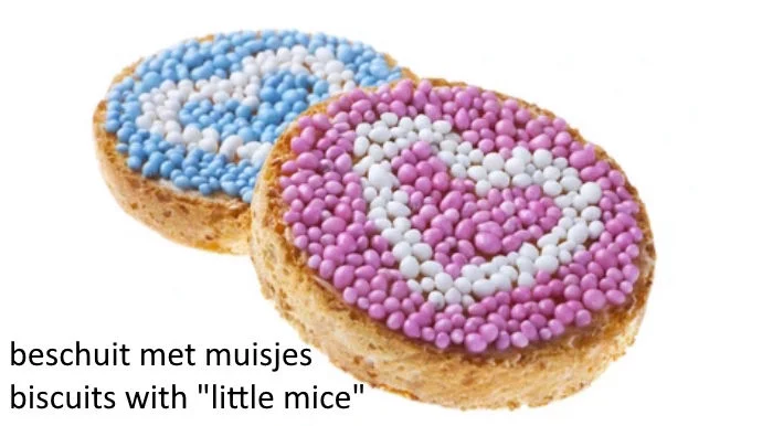 When a baby is born, it sometimes happens in the hospital and sometimes at home. The parents send cards to family and friends to share the good news. When visitors come, an appointment often has to be made first, because the mother and baby need rest. Visitors often receive biscuits (special large cookie) with small sweet (blue or pink). The Dutch expression is “beschuit met muisjes”.