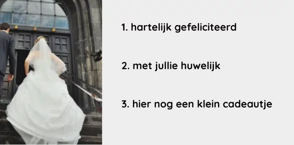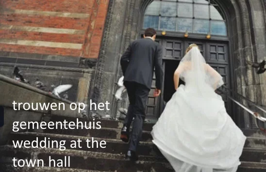 When two people decide to get married, they celebrate their wedding. They send invitations to their family and friends. The bride usually wears a white dress, and the groom wears a suit. The wedding ceremony takes place at the town hall (also known as the “gemeentehuis”), and for religious people, it may also be held in a church. After the ceremony, there is a reception where people congratulate the couple, and in the evening, there is often a party to celebrate. The “just married” couple often goes on a honeymoon afterwards.
